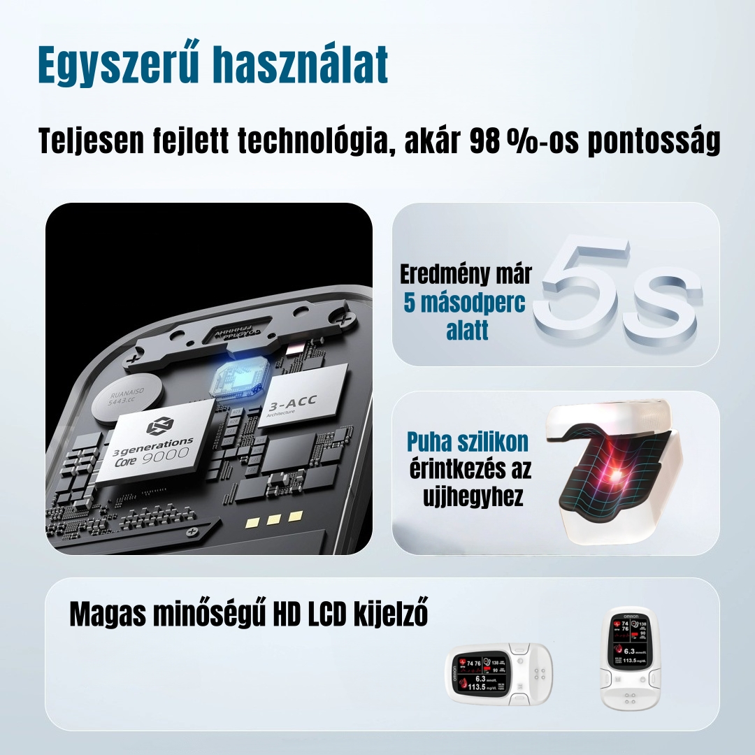 Minden pulzusjelet gyorsan és nagy pontossággal rögzít. Az ultra-alacsony fogyasztású MCU vezérlőchip és a fejlett „LAMBERT BEER” algoritmus kombinációja lehetővé teszi a mérési jelek gyors felismerését, így gyorsabb és pontosabb eredményeket biztosít.