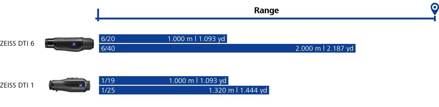 A 40 mm/F1.0 objektívvel, valamint a 640×480@12 µm érzékelővel kombinálva a DTI 6 sorozat akár 2000 méteres észlelési távolságot biztosít teljes sötétségben is.