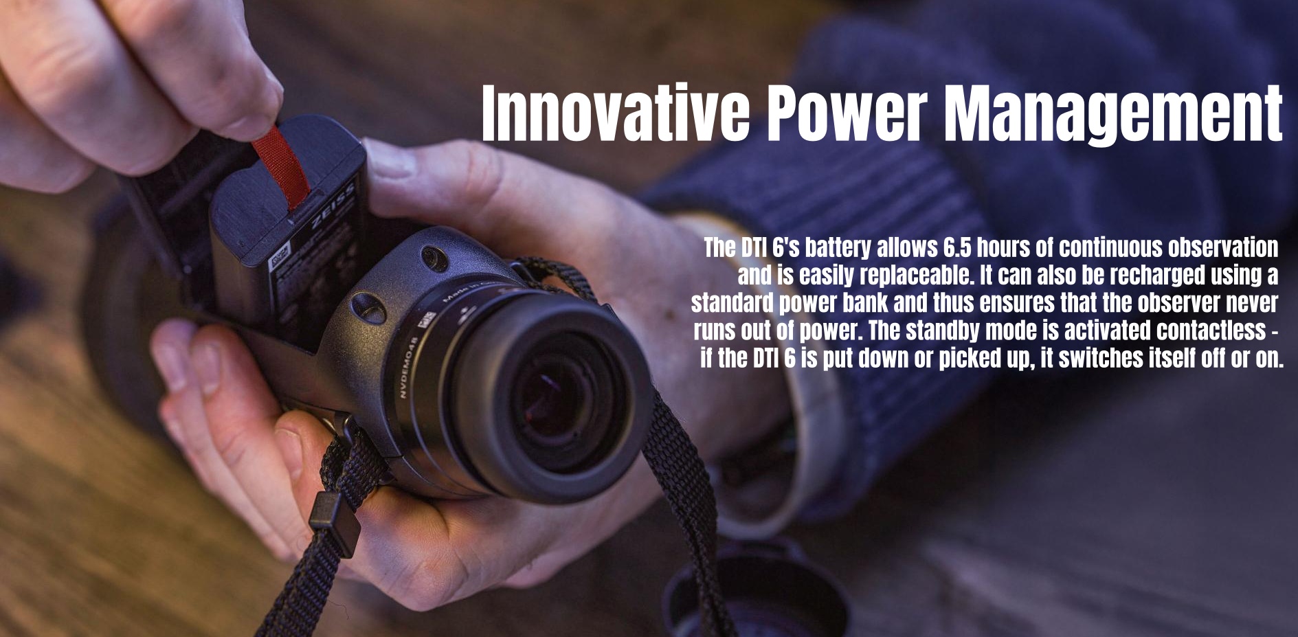 A DTI 6 beépített akkumulátora akár 6,5 órás folyamatos megfigyelést biztosít, és könnyen cserélhető. Töltése egyszerűen, akár egy standard power bankról is elvégezhető, így mindig biztosított, hogy a megfigyelő ne maradjon áram nélkül. Az eszköz érintésmentes készenléti móddal rendelkezik – ha leteszik vagy felveszik, automatikusan kikapcsol vagy bekapcsol.